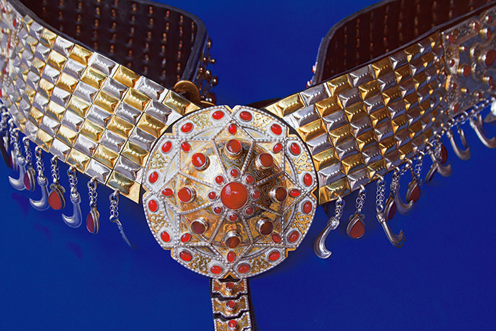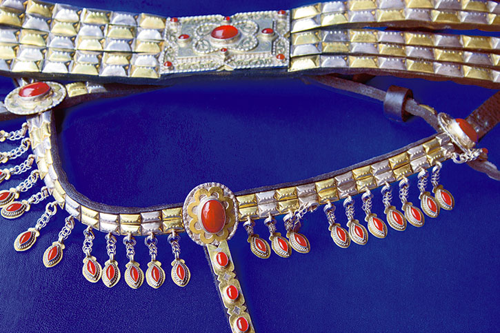 Нагрудная часть сбруи сегодня также несет в себе значение оберега и состоит из центральной выпуклой части и отходящих от нее в обе стороны ремней, соединяющих серебряную пластину с кожаной основой сбруи. В центре этого украшения помещаются либо сердолик, либо бирюза. Кожаная поверхность заполняется мелкими серебряными бляшками, напоминающими рыбью чешую или кольчугу рыцаря, и крупными, орнаментированными накладками с непременными сердоликами. По всей длине кожаных ремней крепятся подвески в виде наконечника копья или изогнутой сабли, которые издают мелодичный звук при ходьбе животного.