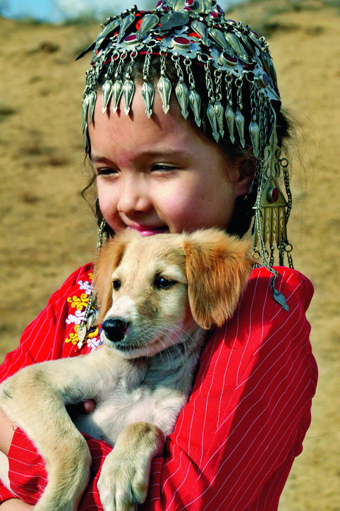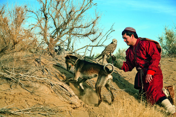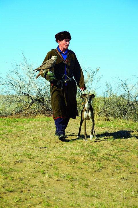 Тазы – уникальная собака, выведенная далекими предками туркмен. Такой породы больше нет нигде в мире, как нет и подобной практики, когда сокол и собака работают в тесном контакте. Не случайно силуэты тазы и сокола помещены в орнамент древнейших туркменских ковров. Работа в тандеме – штука непростая, и тут всякое случается. Чтобы приучить сокола и тазы друг к другу, сокольники, подкармливая птицу, иногда кладут кусочки мяса на голову собаке. Если сокол хоть слегка поранит клювом борзую, он впредь будет относиться к ней с осторожностью. А вообще достаточно двух-трех совместных выходов, чтобы тазы и сокол начали работать синхронно.
