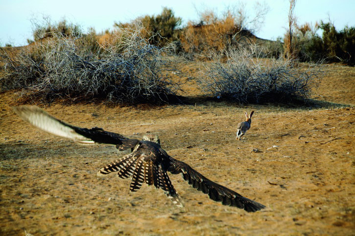 Но сокол – птица не только выносливая, но и упрямая. Балобан будет выслеживать зайца до последнего. При этом сокол должен с ювелирной точностью просчитать расстояние и выбрать миг атаки. Случается, что зайцу все же удается юркнуть в норку. Но и это его не спасет: сокол садится у входа и ждет своего помощника – тазы. Вдвоем они караулят норку, ожидая появления хозяина.