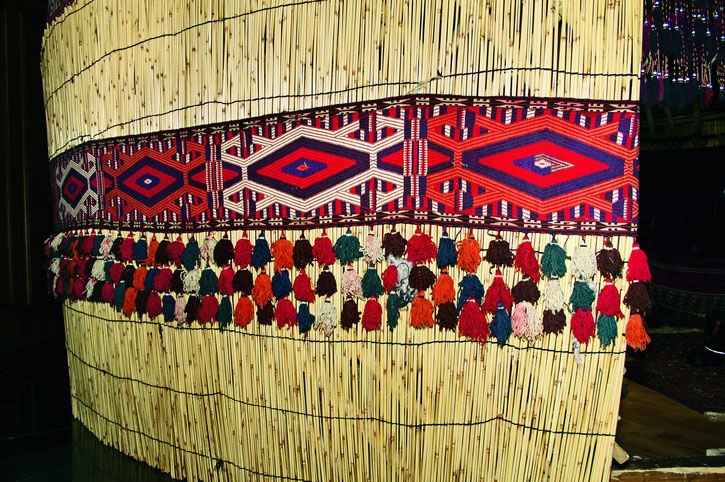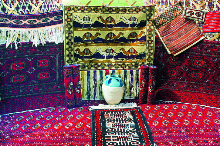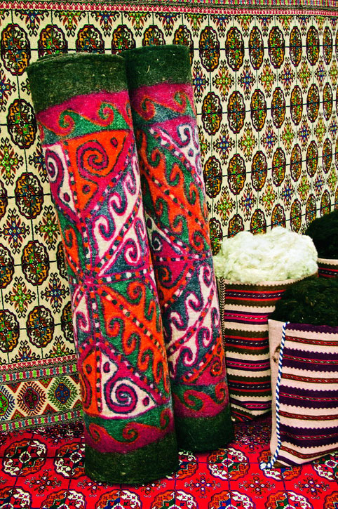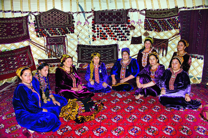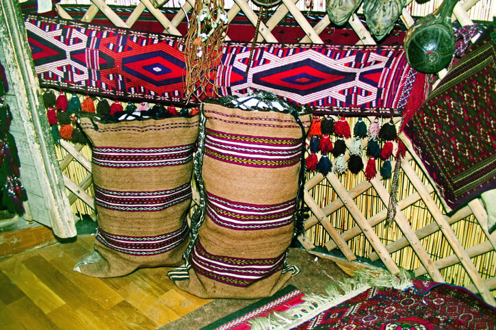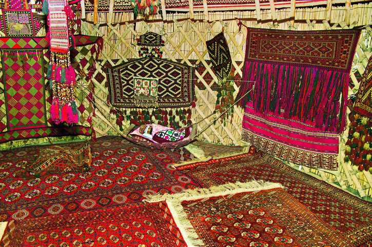 Если конструктивное устройство юрты у кочевых народов Средней Азии в целом одинаково, то самобытность жилища у каждого из них проявляется через особенности внешнего декора и интерьера. В прошлом туркмены вели кочевой или полукочевой образ жизни, и благодаря этому возникли уникальные атрибуты быта, выполненные в ковровом стиле. В быту кочевников ковровые изделия пользовались самым широким спросом. Удобные и практичные при перевозках ковры удовлетворяли различные хозяйственные нужды, употреблялись для утепления жилища, заменяли собой мебель, играли роль сундуков и чемоданов, чехлов для бытовых вещей.