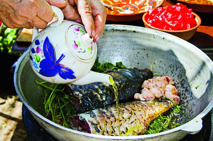 Итак, главный ингредиент будущего блюда – двухкилограммовый сазан – готов к началу кулинарного процесса. Рядышком на кухонном столе уже выложены все необходимые добавки – масло, соль, зелень и овощи. Для того чтобы добиться большей аутентичности, лучше использовать костер: газовая плита не даст такой температурной насыщенности. Посуда для приготовления – вместительный казан: его округлые стенки позволяют равномерно распределить жар.