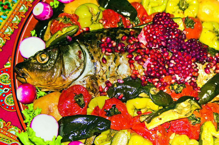 На ковер салатных листьев помещатся зеленая перина из казана, а сверху выкладывается тушка сазана. Красочным обрамлением для рыбы служат узоры, выложенные из пропаренных овощей. Можно полить все это гранатовым соком, но живые гранатовые зерна смотрятся красивее...
