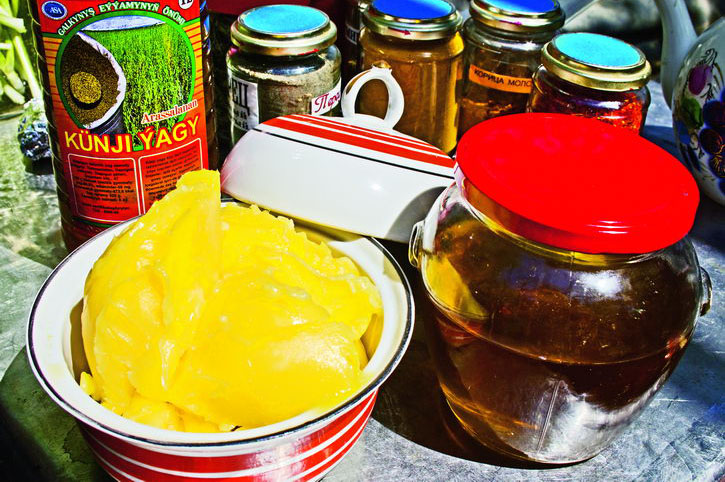 Триста граммов топленого масла быстро тают на сильном огне. Для аромата нужно бросить в растопленное масло несколько гвоздичек, но позже вынуть их, уже отдавших свой аромат. Затем в казан надо добавить 300–350 граммов кунжутного масла (сгодится и подсолнечное) и после высыпать столовую ложку соли.