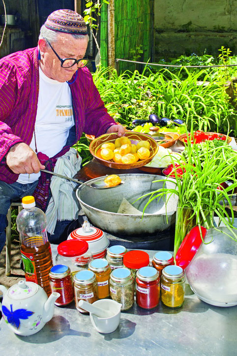 Все это слегка прижимается керамическим блюдом, подобранным по диаметру казана, а затем уже накрывается крышкой и сам казан. Слегка надо добавить пламени и ждать двадцать минут. Теперь блюдо практически готово, но лучше, погасив огонь, дать ему потомиться в медленно остывающем казане еще минут десять – пятнадцать.